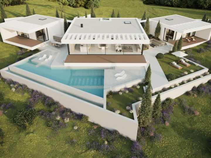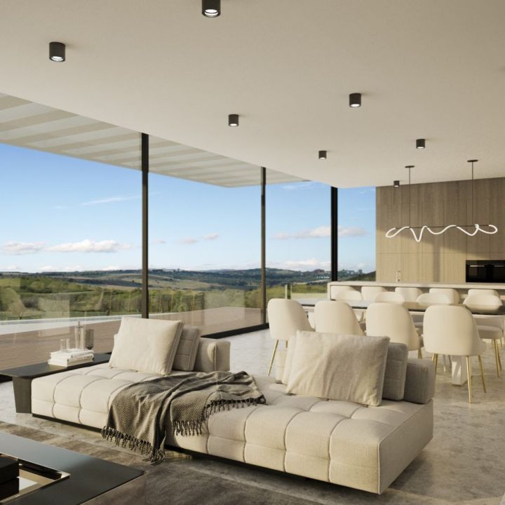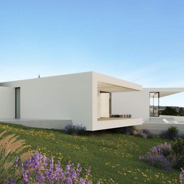 The design of this villa is intricately woven with the rhythm of the sun's journey throughout the year. Gracefully nestled to the south of a gentle hill, it embraces the essence of both summer and winter solstices with exquisite harmony. Rooted deeply in the principles of traditional architecture, it reverently honours simplicity while nurturing a profound connection with the celestial dance of sunlight. The spatial arrangement of the villa artfully divides it into a central social hub and two discreet private wings, enriching the architectural composition with layers of sophistication. This thoughtful layout not only adds dimension to the structure but also invites versatile outdoor experiences, offering enchanting patio spaces for al fresco dining and serene lounging. A magnificent pool graces the southern expanse of the villa, elegantly elevated with a commanding presence against the picturesque backdrop of the landscape.