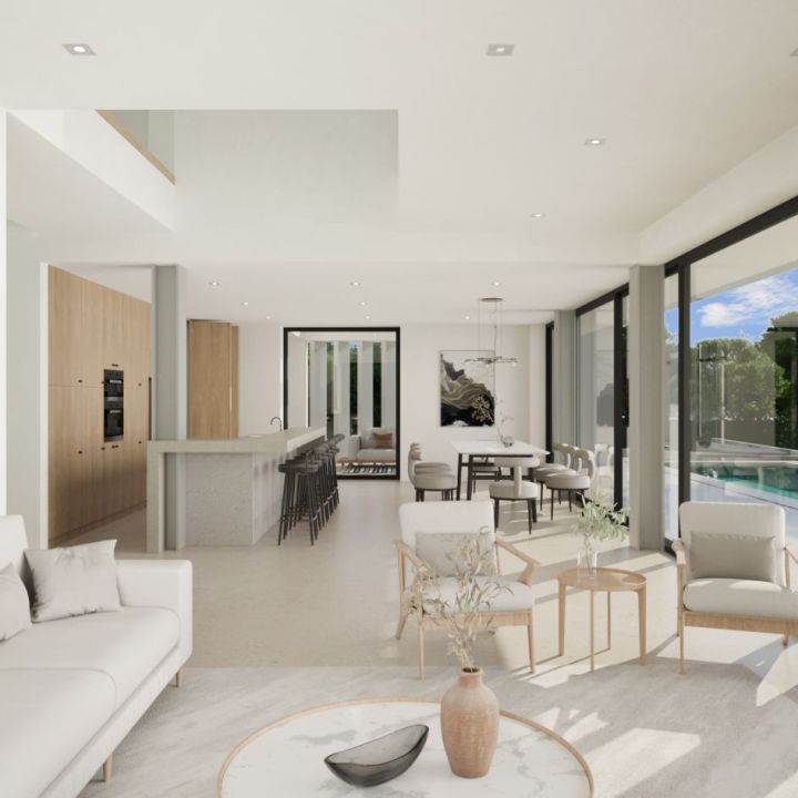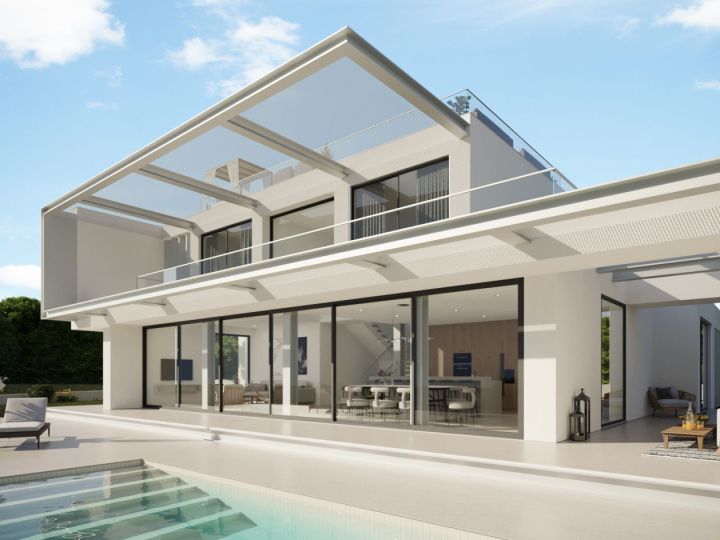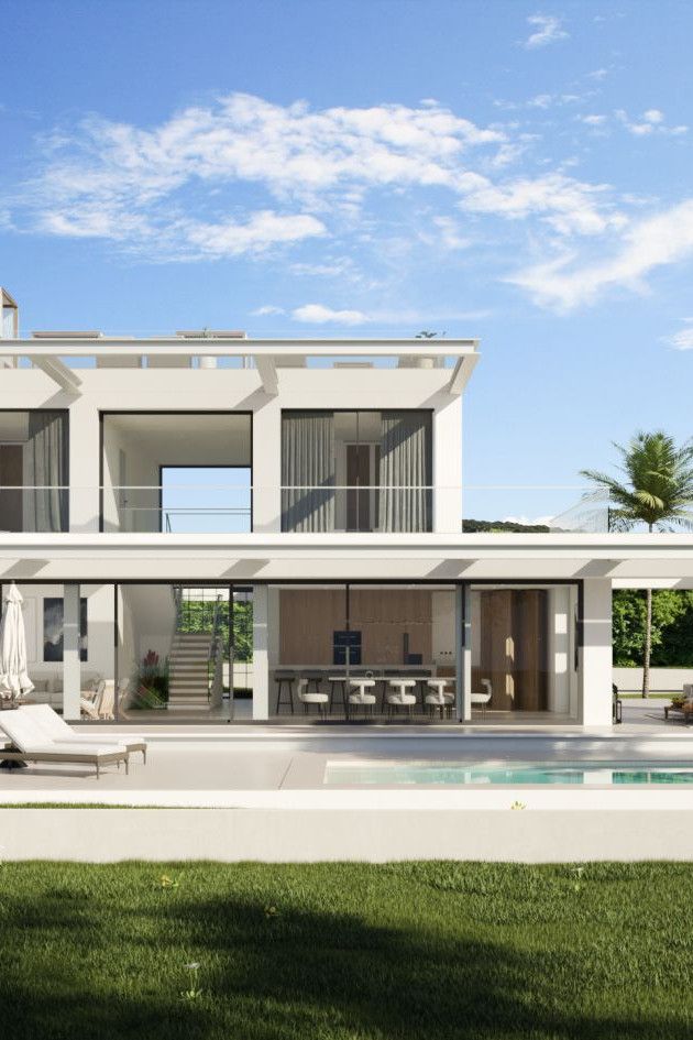 This house captivates with shaded outdoor spaces and a pool facing a living room open to the kitchen, promoting seamless flow. Featuring four bedrooms, it stands out for its elegant S-shaped canopy spanning the two floors, blending functionality and style in perfect harmony.