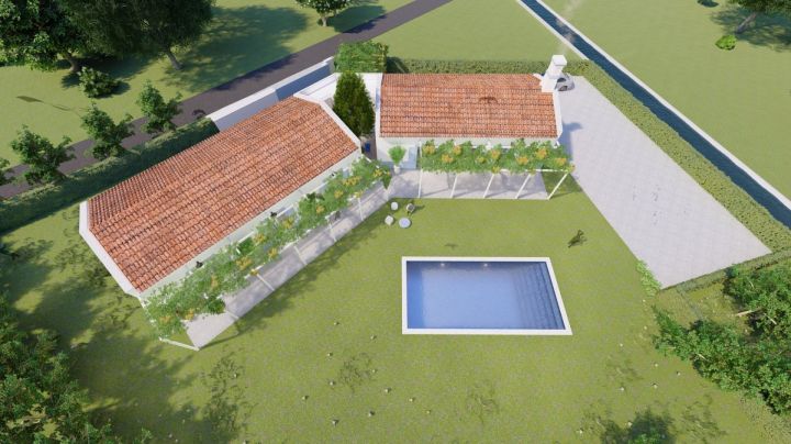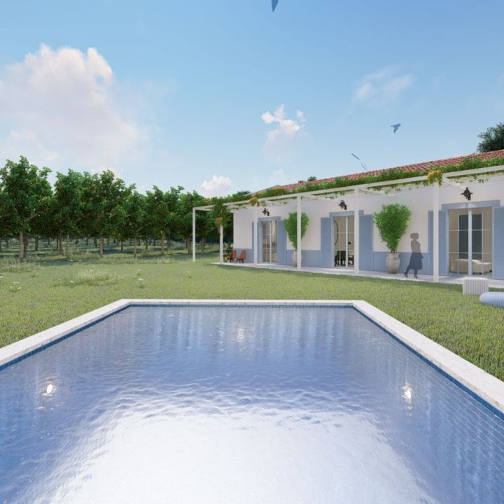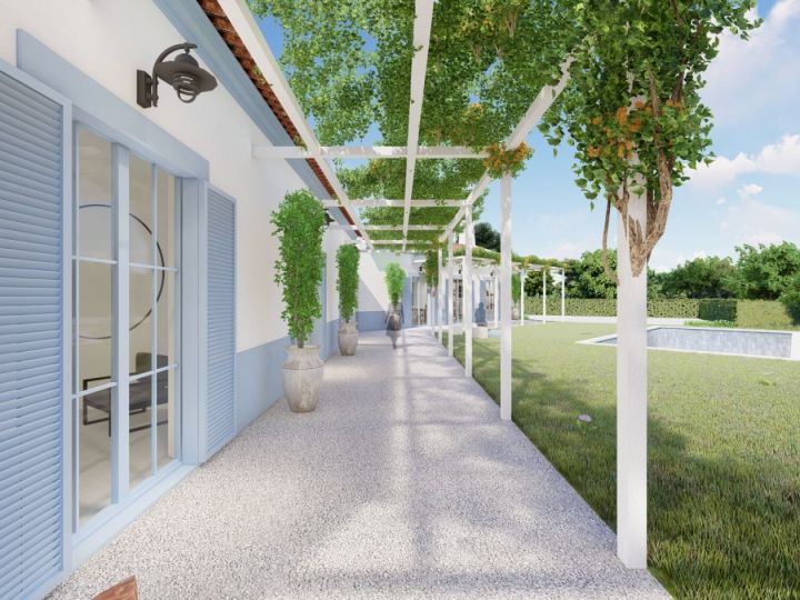 At the heart of tradition stands a Portuguese traditional character house. With its three cozy bedrooms, this house unfolds into two distinct sections. In the Eastern quadrant, the social space flourishes as an invitation to gathering. A spacious kitchen, a welcoming dining room, and an open-space living area intertwine harmoniously. In the Western quadrant, privacy reveals itself in every detail. Three bedrooms, each with its walk-through closets and private sanitary facilities, where tranquillity finds its refuge. Both volumes face the serene pool, framed by white pergolas under the sun's warmth filled with orange bougainvilleas, in perfect harmony with the orange trees scattered across the land, in a spectacle of colours and fragrances. Every angle of this rectangular dwelling is adorned with frames and blue shutters, silent witnesses to the refinement of Portuguese style.