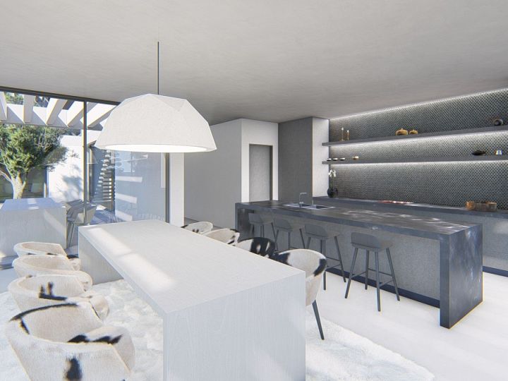 This design was custom-tailored to suit the client's designated spaces, emphasizing the pivotal role of atmosphere. The complex form was elegantly subdued through the strategic play of light and shadow. Additionally, the presence of an infinity pool overlooking the river was a key factor in shaping the overall design concept.