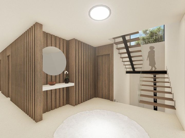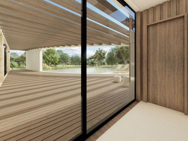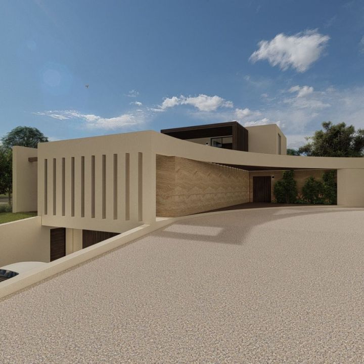 Contemporary-style villa, characterized by pergolas accompanied by large curved elements, which prevail on the spacious surrounding terraces. On the ground floor, there are three bedrooms with private sanitary facilities and walk-through closets, as well as a spacious kitchen, living room, and dining room in an open-space layout. The upper floor consists of one bedroom, a bathroom, and a closet, all with generous areas that include pergola-covered terraces and sea views.